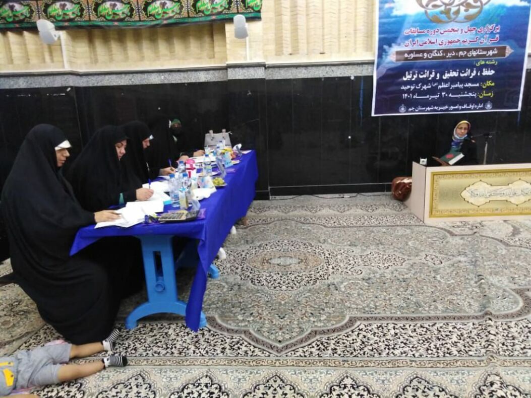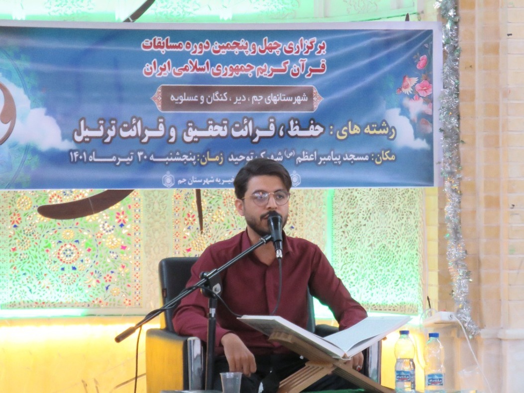 چهل‌و‌پنجمین دوره از مسابقات قرآنی اوقاف شهرستان‌های جم و ریز، دیر، کنگان و عسلویه با حضور 160 نفر از قرآنیان منطقه 3 جنوب استان بوشهر در محل مسجد پیامبر اعظم(ص) شهرک توحید شهر جم پایان یافت.