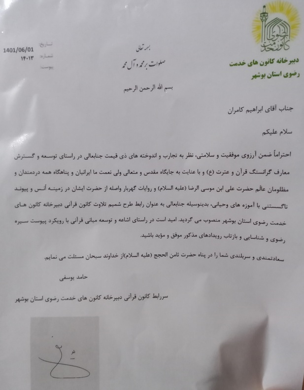 یادآور می‌شود، طی آئینی زهرا کشاورزنیا، مدیرعامل مؤسسه فرهنگی قرآن و عترت طاهای بوشهر و مسئول طرح شباب‌الرضا(ع)، وجیهه زارعی‌آزاد، مسئول طرح مهدالرضا(ع)، حیدر کشاورز، مسئول طرح جلسات خانگی، ابراهیم کامران، مسئول طرح شمیم تلاوت، میکائیل عاشوری، مسئول طرح کرسی تلاوت، حامد فکوری، خبرنگار ایکنا و مسئول رسانه خبری طرح شباب‌الرضا(ع) و کانون قرآنی دبیرخانه کانون‌های خدمت رضوی استان بوشهر به‌عنوان اعضای کانون‌های قرآنی در جلسه دفتر دبيرخانه خدمت رضوی بوشهر با هدف توسعه و پویایی فعالیت‌های قرآنی و عترتی با دو محور جوان‌یاوری و خانواده‌محوری معرفی شدند و احکام خود را از دست فرید محبی، رئیس این دبیرخانه استانی دریافت کردند.