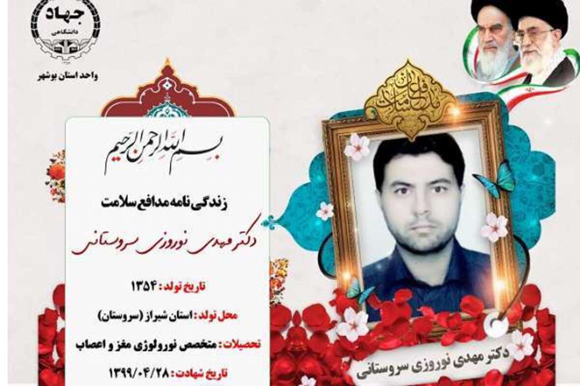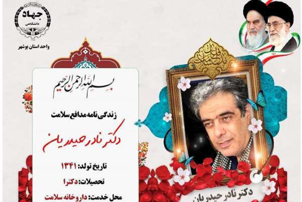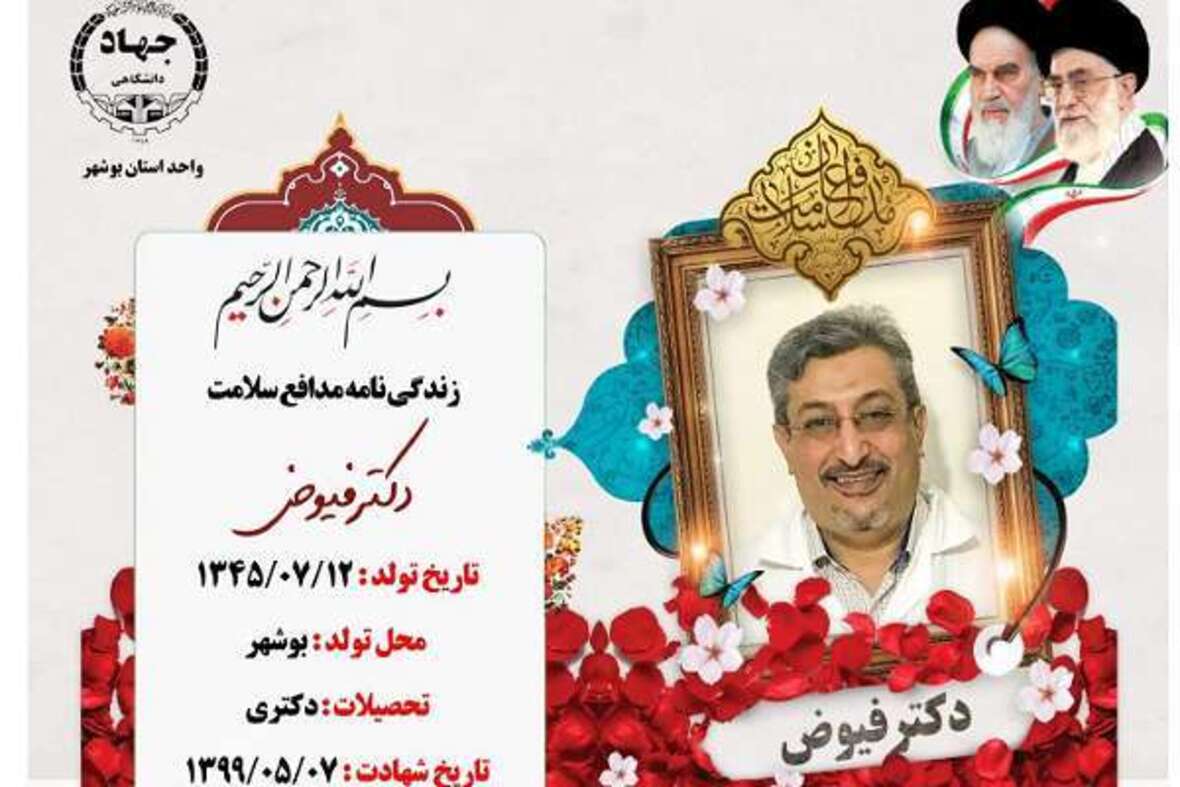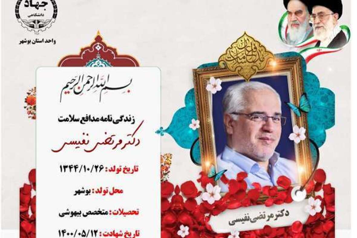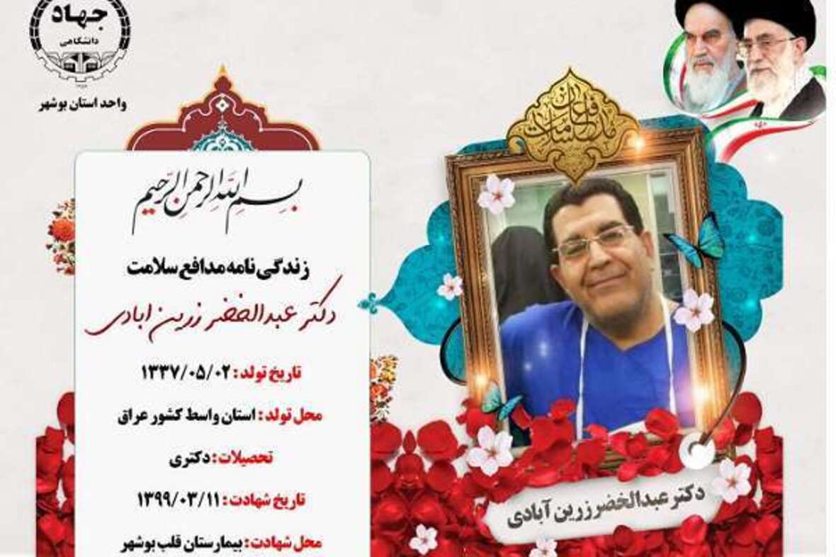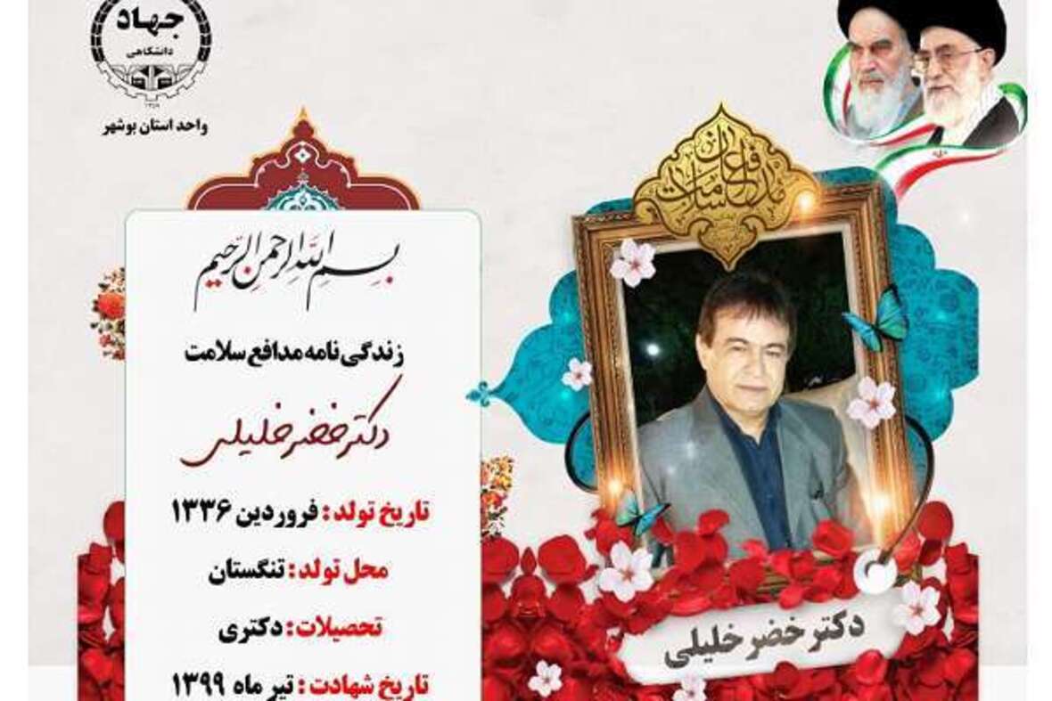 در نخستین یادنامه پاسداشت «مدافع سلامت» استان بوشهر گوشهای از زندگینامه شهید خضر خلیلی، شهید همایون فیوض، شهید مهدی نوروزی سروستانی، شهید نادر حیدریان، شهید مرتضی نفیسی، شهید عبدالخضر زرینآبادی، شهید جهانبخش فخری، شهید زهرا رگبار، شهید زهرا عبداللهی، شهید عبدالحسین بُناری و شهید محمدرضا رزمی؛ به رشته تحریر درآمده است.