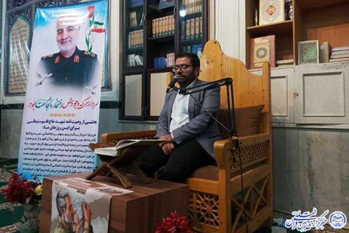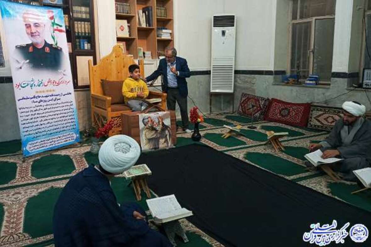 به گزارش ایکنا از بوشهر، محفل انس با قرآن به یاد «سپهبد شهید حاج قاسم سلیمانی» از سوی قرارگاه محله اسلامی شهدای نیدی و با همکاری مؤسسه قرآنی حبلالمتین شامگاه ۱۷ دیماه، در محل مسجد شهید سیدمصطفی خمینی(ره) منطقه یک بندر خلیجفارس بوشهر برپا شد.